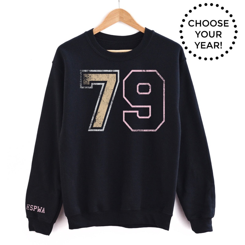 Black fleecepullover unisex sweatshirt with distressed year printed on front in grey, beige, and pale pink. Sleeve detail w/ espwa. logoin pink.