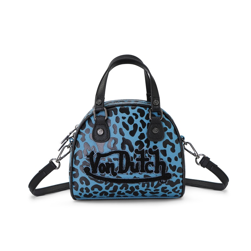 Von Dutch Mini Bowling Bag Color: Blue Classic Von Dutch Cheetah Pattern Silver 'Von Dutch' Logo Hardware Soft Vegan Leather Crossbody Strap / Top Handles Branded Von Dutch Inside Lining with zipper pouch